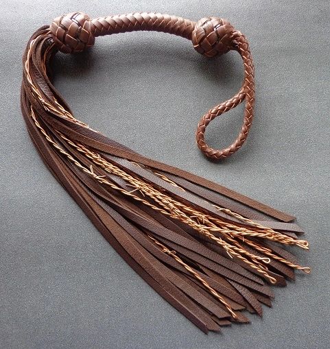 (Above) Airin flogger made with soft New Zealand deerskin, with added barbed wire (leather cord) mixed in. Custom made July, 2018. (#ai007)