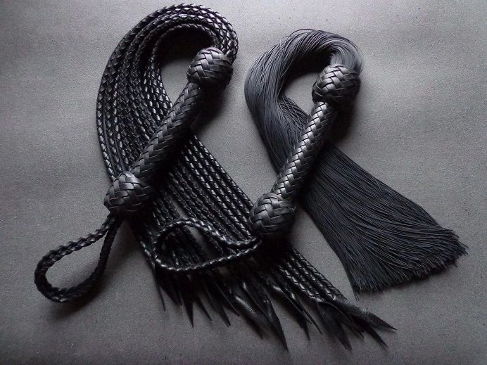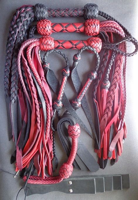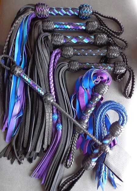 (Above) 8-piece set includes 9-tail ballbuster, strap flogger, braided cat, twin lion tails, twin Airin floggers, and Whomper. Custom made April, 2017. (#set008)