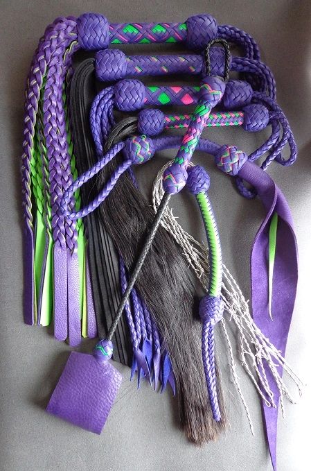 (Above) 6-piece set includes 2 Chaos floggers, extra long Airin braided cat, Airin deerskin flogger, Airin horsehair flogger, and Airin rubber strand flogger. Custom made December, 2019. (#set002)
