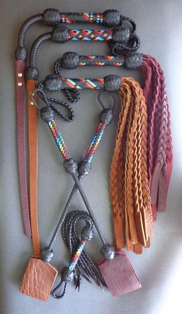 (Above) 6-piece set includes double flat cat, twin Chaos floggers, twin mini dragontails, whomper. Custom made June, 2017. (#set007)